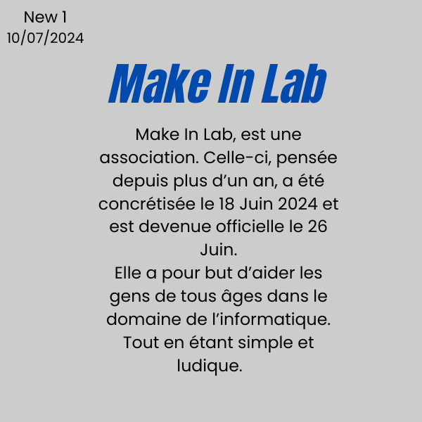 Make In Lab est une association qui a été conceptualisée pendant plus d'un an avant d'être concrétisée le 18 juin 2024 et officiellement lancée le 26 juin 2024. Son objectif est de soutenir les personnes de tous âges dans le domaine de l'informatique de manière simple et ludique.
